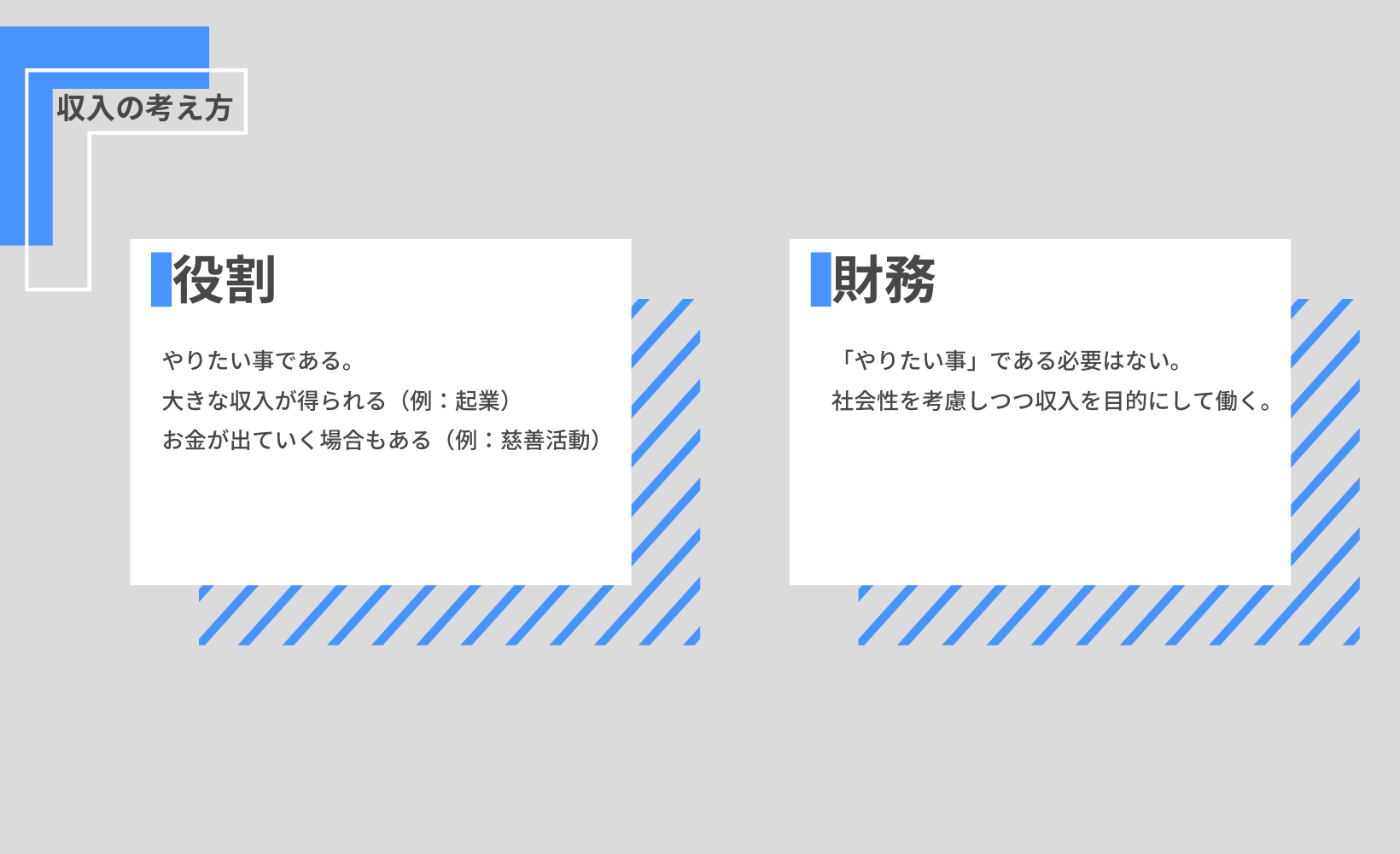 社会性を考慮しつつ収入そのものを目的にした働き方をTSUTOMEでは財務としました。